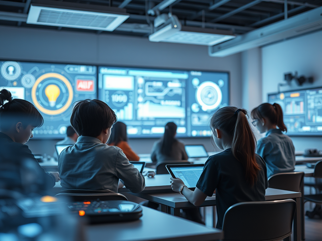 Imagem de capa criada através de IA, com base no comando “Crie uma imagem em destaque que encapsule o tema “IA e o futuro da educação”. As disciplinas principais devem incluir um ambiente de sala de aula futurista com alunos envolvidos na aprendizagem colaborativa, utilizando tecnologias como tablets e telas interativas. Incorpore elementos como interfaces digitais, algoritmos de IA representados visualmente e símbolos de criatividade (por exemplo, lâmpadas, engrenagens). Use iluminação ambiente suave para criar uma atmosfera convidativa, com foco na interação entre tecnologia e interação humana. Certifique-se de que a imagem seja de alta resolução, altamente detalhada e com foco nítido para transmitir de forma eficaz o impacto transformador da IA na educação.”